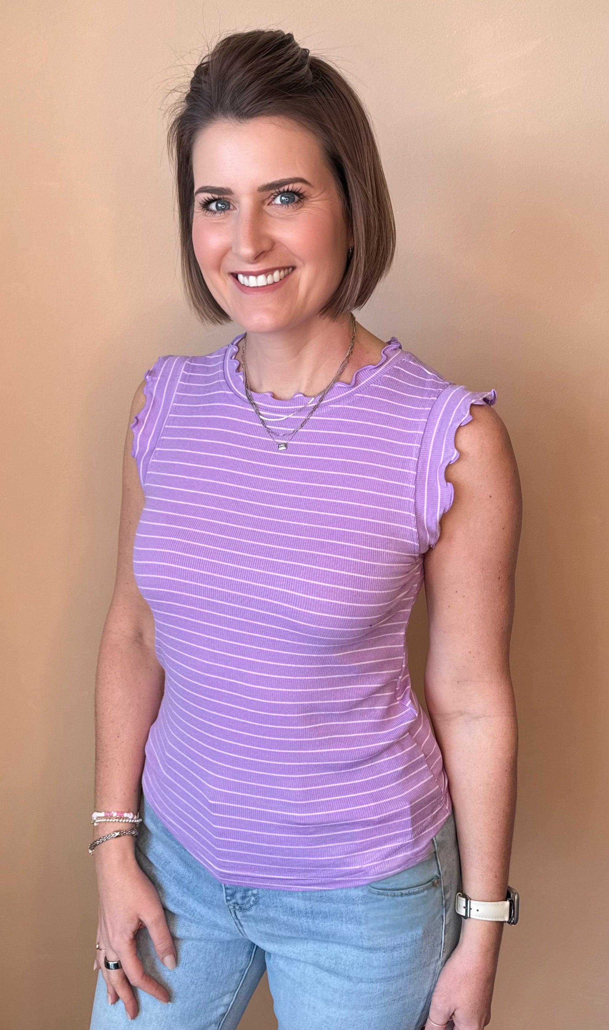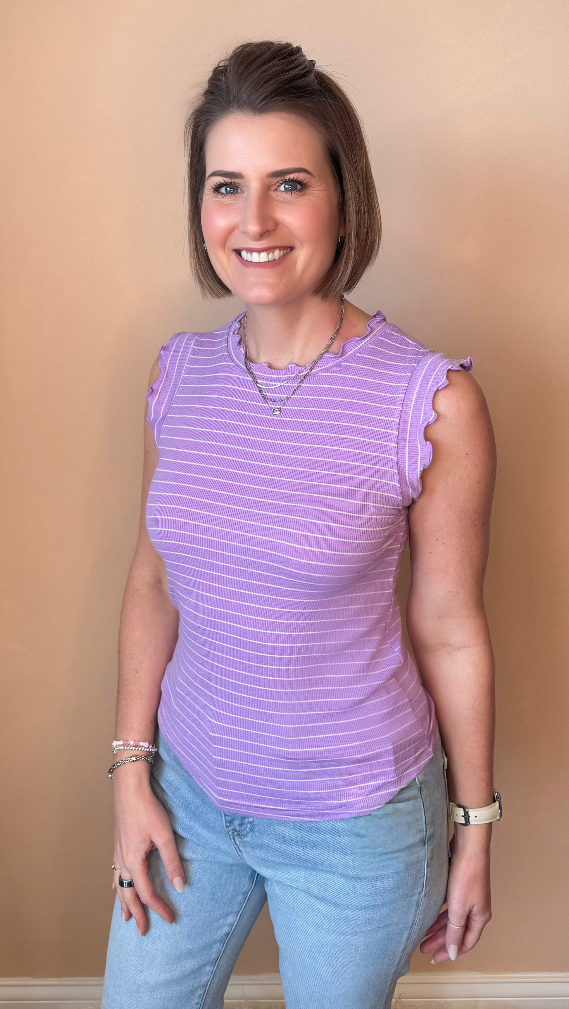 A sweet little staple with just the right amount of detail. The Fiona Ruffle Striped Tank features soft stretch fabric, classic stripes, and feminine ruffle sleeves that make it feel a bit more special than your everyday basic. Easy to wear solo or layered under cardigans and jackets.