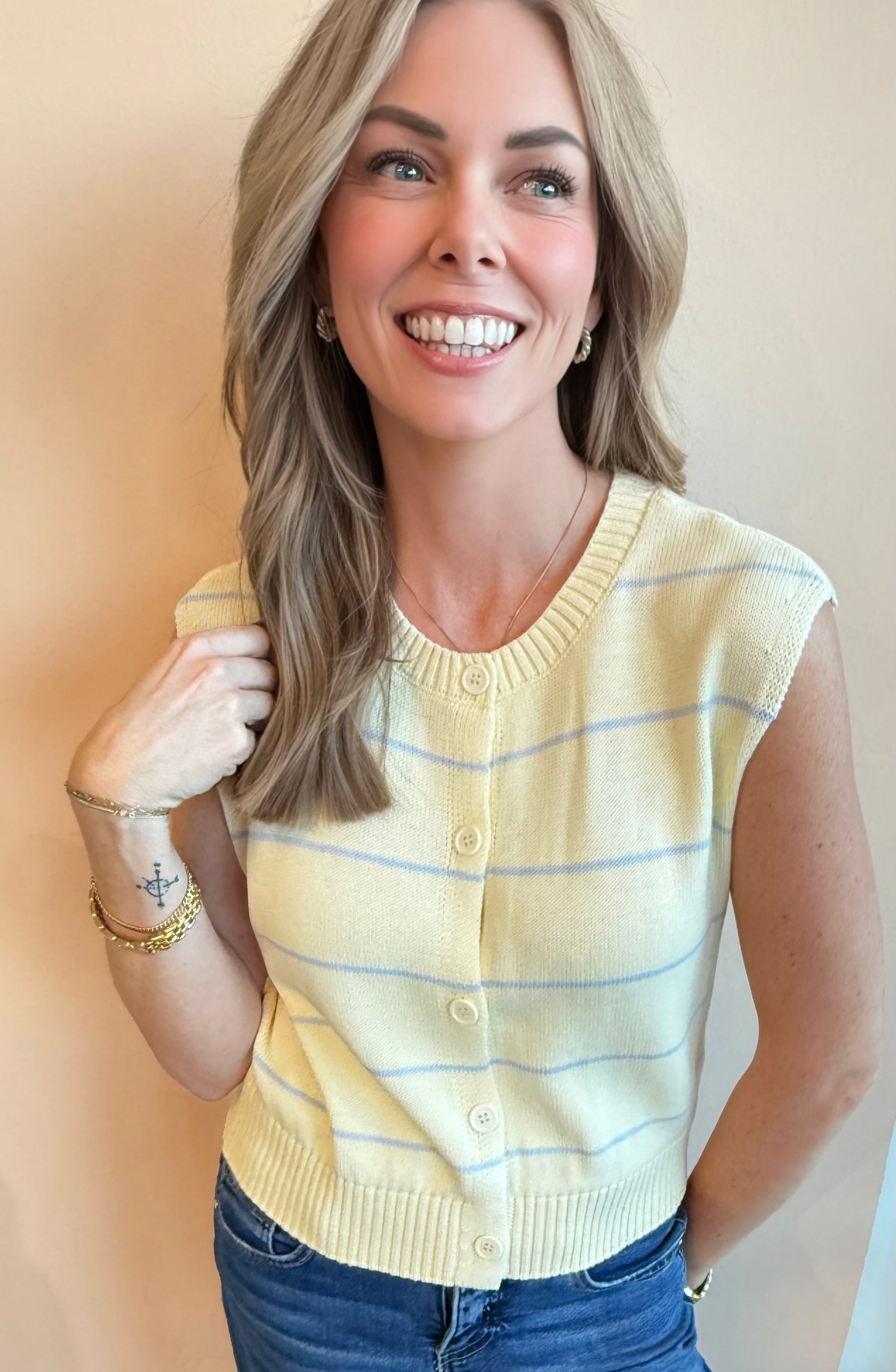 This sweet little sweater is giving fresh, polished, and quietly put-together. The Hydrangea Sleeveless Sweater is the kind of piece that instantly makes an outfit feel intentional—easy to wear on its own now and perfect for layering as the seasons shift. Soft, classic, and endlessly wearable.