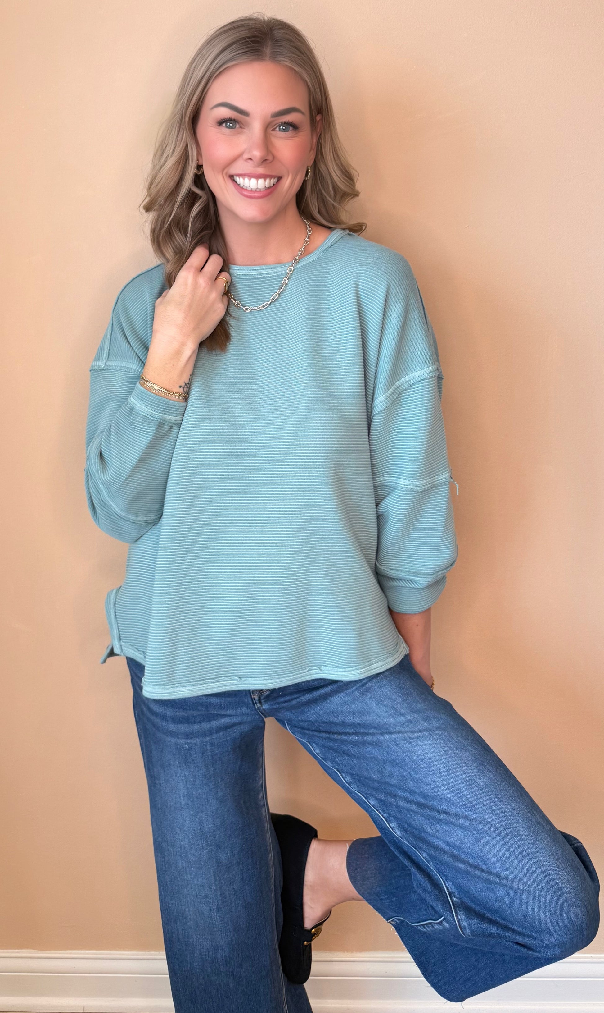 The kind of sweatshirt you throw on “just for a minute”… and somehow end up wearing all day. The soft waffle knit texture gives it that cozy, lived-in feel, while the relaxed shape keeps it cute and easy (not bulky or sloppy). It’s lightweight enough for layering now and perfect on its own for cool mornings, coffee runs, and everyday life.