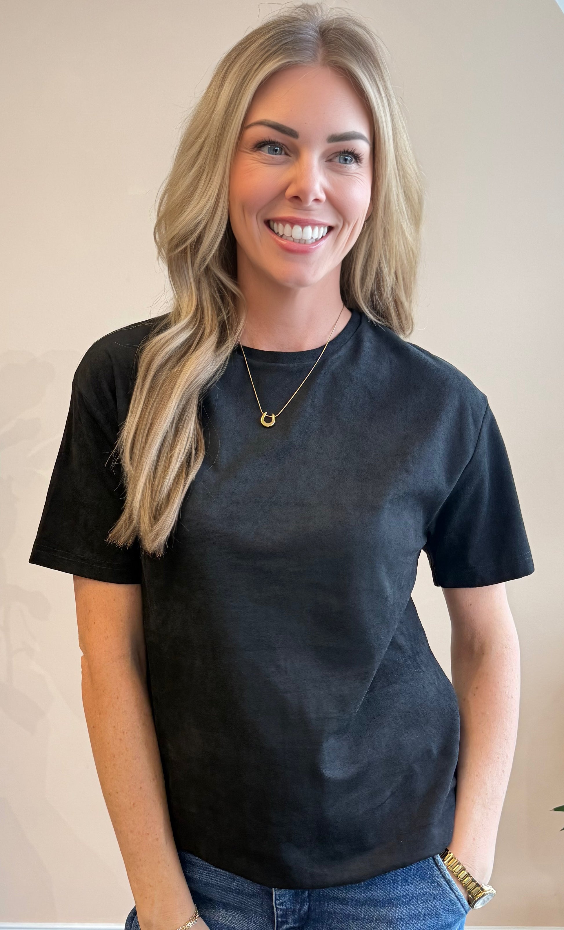 The Mila Sueded Tee is the definition of soft sophistication. With its buttery sueded finish and relaxed silhouette, this short sleeve is perfect for layering or wearing solo. Effortlessly chic and endlessly versatile, it’s the kind of everyday staple your wardrobe will thank you for.