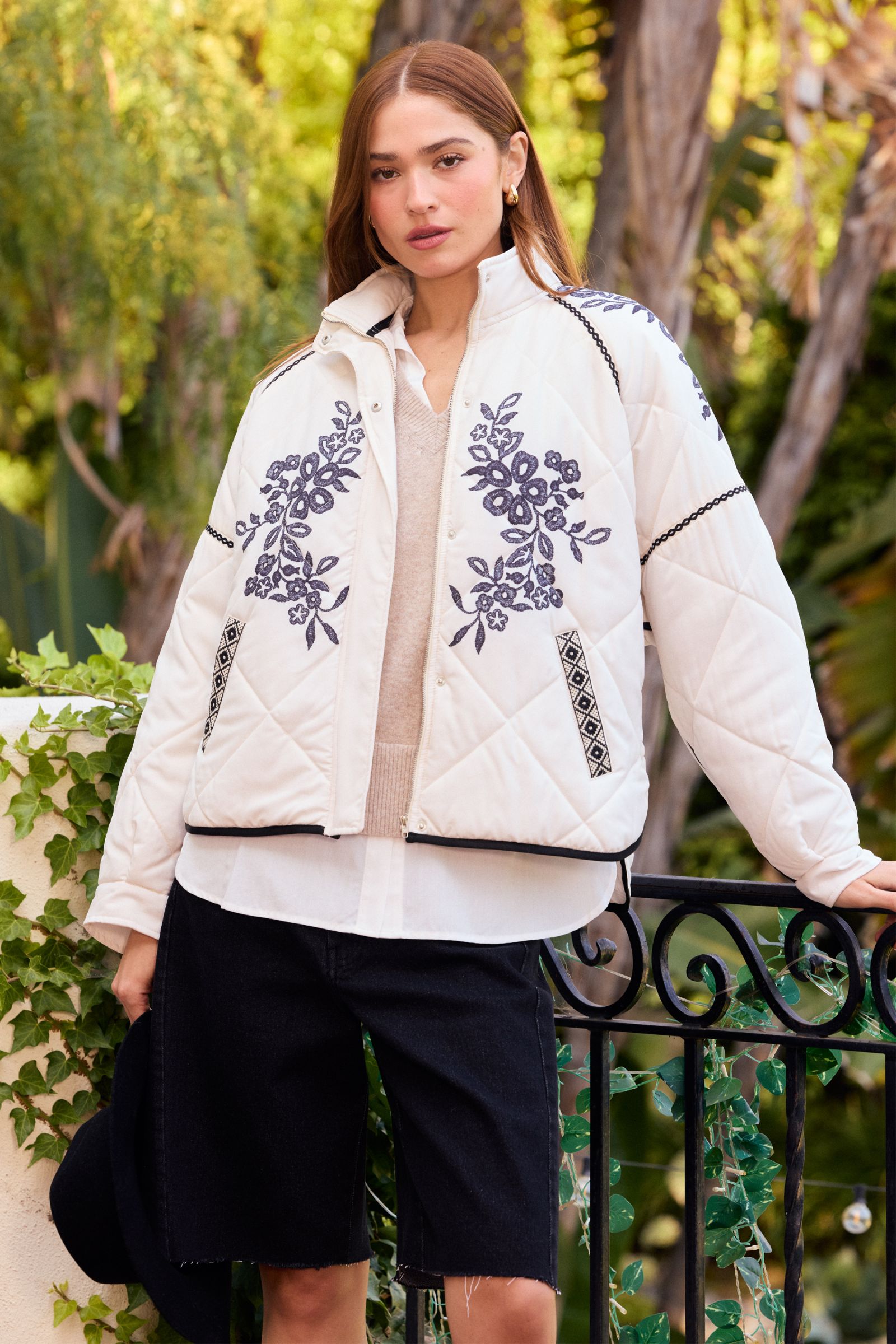 Elevate your outerwear game with the Noelle Jacket, a chic quilted style that blends cozy comfort with striking embroidered details. Featuring bold floral embroidery and contrast trim, this jacket is perfect for layering over your favorite everyday looks while making a statement.