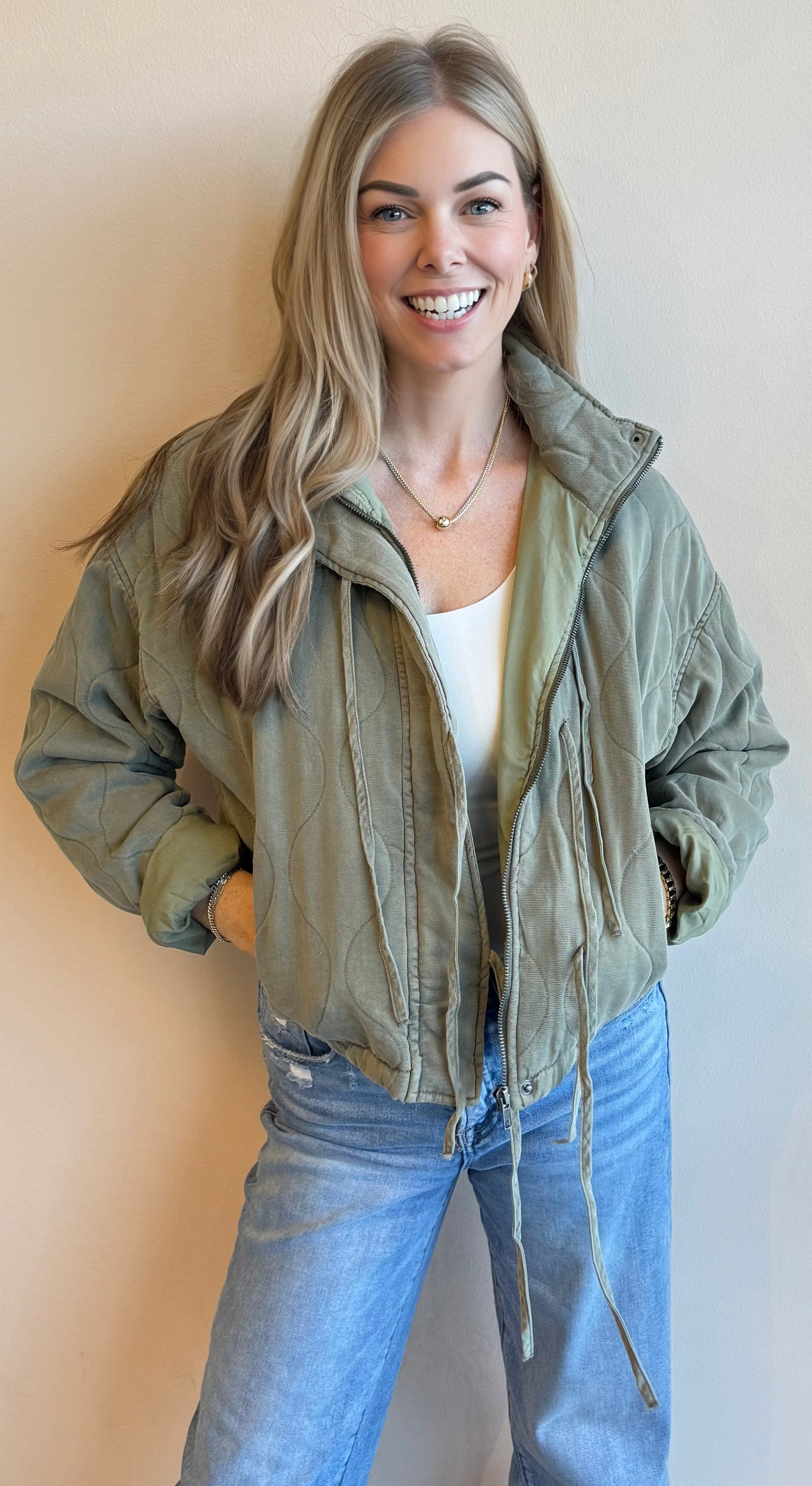 A fresh twist on a fall classic, The Quilted Tie Front Jacket blends cozy texture with chic utility. Featuring quilted detailing and unique tie-front closures, this jacket brings effortless style to crisp-weather layering. Its lightweight design makes it perfect for tossing on over sweaters or tees, while the earthy olive tone adds that timeless, wear-with-anything vibe.